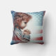Uma criança de cabelo encaracolado é vista rezando com as mãos apertadas, posicionada contra o pano de fundo de uma bandeira americana