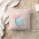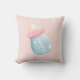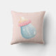 Travesseiro com uma imagem fofa de uma garrafa de bebê azul-claro com uma jante rosa. fundo do padrão de bolinhas.