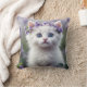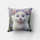 Um gatinho branco liso, com olhos azuis em greve, é enfeitado com uma delicada coroa de flores lilás roxas
