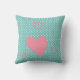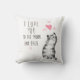 Este travesseiro decorativo adoravelmente fofo tem uma ilustração de um gatinho ou gato cinza no lado da frente com corações cor-de-rosa e texto preto que diz: "Eu te amo na lua e de volta" sobre ele. O verso do travesseiro tem um padrão de bolinhas aqua e branca com grandes corações cor-de-rosa sobrepostos no topo.