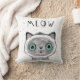 Este travesseiro decorativo adoravelmente fofo tem uma ilustração da face de uma cinza e um gatinho branco ou gato com grandes olhos azuis turquesa na frente com texto preto que diz: "MEOW." sobre ele. O verso do travesseiro tem uma cor aqua com estrelas aqua mais leves e uma grande redação branca que diz: "Você é mágico" sobreposta no topo.