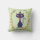 Um gato preto mágico usa um chapéu pontiagudo de bruxa cercado por flores de outono e vassoura. Delicadamente colocado contra um fundo verde menta. Ilustração original de Noël Snow