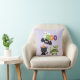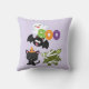 Um travesseiro com um morcego voador preto, um morcego múmico verde vestindo bandagens brancas e um gato preto bonito com um chapéu de bruxa laranja. Boo escreveu em letras coloridas divertidas com um fantasma feliz flutuando para trás.