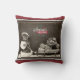 Uma fotografia Natal vintage com um gato super fofo vestido de feriado com aquecedor de mão. O gato está puxando um trenó de presentes embrulhados. Mensagem: Saudações da Estação. Este travesseiro tem uma cor sólida reversível vermelha escura.