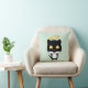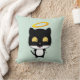 Um travesseiro com um gatinho de anjo preto e branco, bonito, com um halo ouro acima da cabeça, desenhado no estilo de desenho animado. Pasta verde.