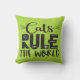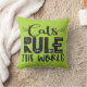 Trendy e adorável travesseiro verde moderno com as palavras "Gatos governam o mundo", decorado com bigodes brancos, arranhões de gatos, um ratinho minúsculo e uma pata.