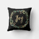Esta maravilhosa travesseiro de Natal apresenta uma festiva camada aquosa de folhas de ouro, verde de Natal e bagas brancas em um fundo preto moderno. A palavra "alegria" aparece em elegante, falsa caligrafia dourada.