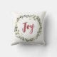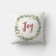 Esta maravilhosa travesseiro de Natal apresenta uma festiva camada aquosa de folhas de ouro, verde de Natal e bagas brancas em um fundo preto moderno. A palavra "alegria" aparece na elegante caligrafia vermelha.