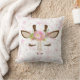Este travesseiro apresenta um rosto de girafa adorável, decorado com flores e folhagem cor-de-rosa e verdes macios. De um lado do travesseiro, os olhos da girafa estão fechados, e do outro lado, estão abertos. Em cada lado, a imagem é colocada sobre um sutil fundo rosa e dourado estrelado.