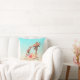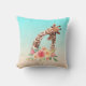 Um travesseiro com um desenho fofo em aquarelas de uma mãe e girafa bebê. A girafa-mãe está descansando a cabeça sobre a girafa do bebê, amorosa e adorável. Bonito buquê rosa, amarelo, verde, de flor de aquarela colocado debaixo deste par de queridos. Um fundo gradiente criado com uma delicada mistura de cor azul turquesa numa cor castanho arenoso.