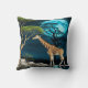 Uma girafa se sustenta graciosamente por um lago sereno, iluminado pelo brilho de uma lua de cheio, cercada por silhuetas de árvores contra um céu estrelado.