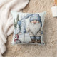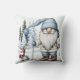 Um gnomo com barba branca vestindo um chapéu azul de inverno e segurando bastões de esqui no chão nevado próximo a um coelho vestido com um cachecol vermelho
