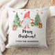 This cozy pillow features a whimsical Scandinavian-style gnome dressed in a bright red hat and mittens, holding a glowing lantern between two beautifully decorated Christmas trees. Wrapped presents and colorful snowflakes complete the joyful winter scene, all set against a crisp white background for a clean, modern look.