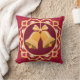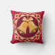 Retro-looking golden bells on a wine-red background, held in an ornate circular frame, make a festive throw pillow for the holidays.