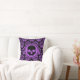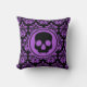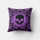 Um travesseiro decorativo decorador elegante em damasco preto e roxo, com um crânio encarnado preto no centro. Bonito decoração gótica para o Halloween ou qualquer hora.