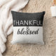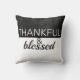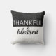 Travesseiro decorativo de citação agradecida e abençoada tem texto sobre cinzas escuras e fundo branco para decoração domiciliar.