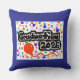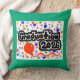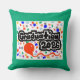 A 20"x20"= 0ptional, Cotton=Optional, throw pillow, = with a Drawing/Design of the word Graduation 2026 in the color Black and White, and some colorful confetti and a red balloon, on the front and Back of the pillow, with a medium green color background, on the Front and a Navy Blue color Background on the Back = (Drawing/Design by P.J.M.)
