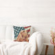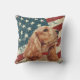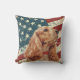 Um belo retrato de aquarela de um cão Cocker Spaniel de cor amarela é colocado contra um fundo verde da bandeira dos EUA. Ambos os lados do travesseiro têm a mesma imagem.