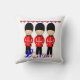 Um travesseiro decorativo tão bonito, branco e azul, London Themed com três pequenas Guardas do Palácio de Buckingham em pé. sob as bandeiras do Union Jack Bunting e sublinhado pelo texto londrino com o famoso símbolo de Londres Eye. Uma imagem muito britânica de diversão e tendências.