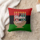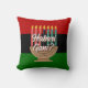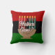 Na moda HABARI GANI? Travesseiro decorativo Kwanzaa, com fundo pan-africano de vermelho, preto e verde e sete velas (Mishuma). Habari Gani? é a típica saudação suaíli durante Kwanzaa (que significa 'Qual é a notícia?'), e a resposta será cada um dos Nguzo Saba ou sete princípios de Kwanzaa, Umoja, Kuchagulia, Ujima, Ujamaa, Nia, Kuumba e Imani. A palavra 'Kwanzaa' foi adicionada como um padrão de fundo tiled no painel vermelho (opcional, para que você possa editar ou excluir). Os princípios Kwanzaa individuais e os presentes congruentes também estão disponíveis. Escolha entre uma ampla seleção de cartões e presentes Kwanzaa projetados por Designs Bereanos.