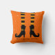 A decoração de Halloween com calçados gráficos de bruxas e sua meia e "é uma estação assustadora" em fontes divertidas. Do outro lado estão as listras pretas e amarelas com o travesseiro decorativo do nome da família.