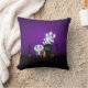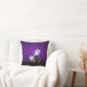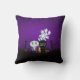 Um travesseiro divertido assustador com um design de halloween assustador. Colocado em um cemitério escuro e assustador. Um cascalho diz RIP, com uma vela e alguns crânios brilhantes no chão. Uma vedação cremosa velha se inclina para o lado. Um adorável esqueleto sorridente está acenando e alguns fantasmas legal estão girando no ar. Colocado sobre um fundo de gradação preto e roxo.
