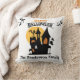 Celebrar a estação assustadora com este travesseiro decorativo com o tema do Dia das Bruxas com uma casa assombrada, bruxas voadoras, morcegos e fantasmas amigáveis. Perfeito por adicionar um toque festivo à sua decoração. O texto na parte inferior é personalizável, para que você possa adicionar seu próprio nome de família ou mensagem especial.