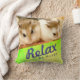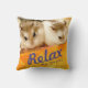Travesseiro de hamster fofo e divertido. Ilustrado com um adorável hamster robo marrom e branco. Ela tem um nariz rosa giro e sussurros brancos longos. O travesseiro tem uma mensagem para "Relaxe e Seja Feliz". Os designs coloridos geométricos laranja e verde dão ao travesseiro um aspecto brilhante extra.