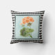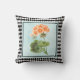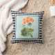 O travesseiro decorativo bonito apresenta uma ilustração do estilo botânico de flor de Geranium no fundo do denim de luz angustiado com uma estrutura de padrão de harlequin preto e branco.