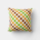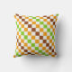 A vibrant checkered pattern of alternating green, orange, and brown squares on a white background. The design creates a lively, geometric feel.