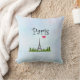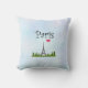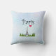 Um travesseiro com um desenho cômico da Torre Eiffel no fundo cercado por árvores verdes. Um coração cor-de-rosa e a tipografia de Paris adicionam um talento feminino.