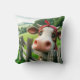 Uma vaca bonita com olhos grandes e expressivos veste uma bandana vermelha e se inclina sobre uma cerca de madeira em um ambiente pastoral verde e luxuoso.