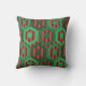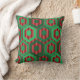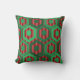 Esse travesseiro decorativo tem um design geométrico de hexágonos em quatro tons de verde num campo de faixas em dois tons de vermelho.