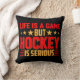 A vida é um Jogo, mas Hockey é um travesseiro decorativo de hóquei em texto vermelho e ouro.