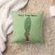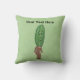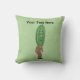 Este travesseiro decorativo tem um homem divertido com um terno marrom com uma cabeça de picles verde grande que tem um rosto chocado sobre um fundo verde-claro. Personalize seu texto com o modelo na frente e atrás.
