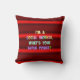 Humor social, texto pastel em fundo vermelho escuro, travesseiro decorativo.