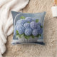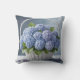 Uma cesta branca mais vadia cheia de hidrâncias vibrantes azuis e roxas repousa sobre uma superfície com flores adicionais na mesa