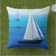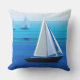 Travesseiro decorativo em Semi abstrato, arte poster minimalista de um iate no mar, sobre um cobalto e fundo azul-ceruliano do oceano