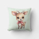 Travesseiro com uma ilustração de um adorável veado bebê. Olhos grandes orelhas com cabeça grande e pequenos galhos castanhos. Vestindo um grande arco vermelho.