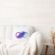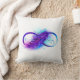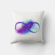 Símbolo infinito com uma bela pena pintada em cores roxas e azuis brilhantes sobre fundo branco.