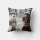Um boneco de neve e um cão do Setter irlandês vestidos de chapéu e cachecóis ficam lado a lado numa floresta nevada