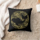 travesseiro na moda preto impresso com um design de peixe preto e ouro. Silhueta de peixe preto em um círculo decorativo de ouro.