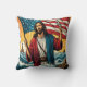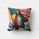 Uma representação serena de Jesus em pé em meio a ondas de choque, orgulhosamente segurando a bandeira americana, com uma igreja silenciada contra um pano de fundo brilhante do pôr do sol.