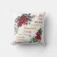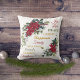 Este bonito travesseiro de feriado apresenta uma imagem festiva de buquê de poinsettia vermelha e verde-aquarela no canto superior esquerdo e outra imagem no canto inferior direito. No centro do travesseiro estão as palavras associadas ao Natal, incluindo alegria, amor, paz, risos, presentes, música, família, amigos, felicidade e crianças. O texto está em vermelho, verde e dourado. A imagem e o texto são colocados sobre um fundo branco puro. Ambos os lados do travesseiro têm a mesma imagem.
