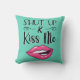 Este travesseiro trendy kiss me apresenta um desenho de um par de lábios magenta de batom e a legenda Cale a boca & Beije-me numa fonte moderna preta sobre um fundo azul claro.