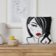 Tema brilhante e retrô feminino em preto e branco. Uma bela mulher com lábios vermelhos e cabelo encaracolado. Divertido, retro desenho.