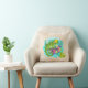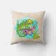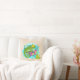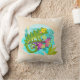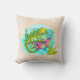 Travesseiro com ilustração fofinha de um lagarto tropical verde rodeado de folhas e flores de cor azul-turquesa. Fundo bege castanho claro.