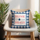 Travesseiro patriótico quadrado apresenta design de tipografia "Home of the Brave" com sotaque estelar e padrão de xadrez de gingham azul marinho. Cores vermelho, branco e azul marinho.