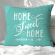 Transforme sua casa em um lar com esta almofada azul personalizada com um design clássico de "Lar Doce Lar" em uma fonte cursiva branca. Adicione o nome da sua família e o ano de fundação para criar um acessório único e acolhedor para a sua sala de estar ou quarto.