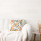 Laranjas frescas e folhas verdes em um travesseiro decorador branco com brilho dourado.